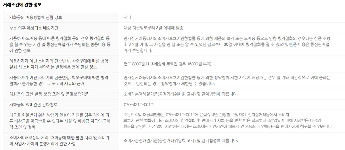 - 배송비 : 기본배송료는 6,000원 입니다. (도서,산간,오지 일부지역은 배송비가 추가될 수 있습니다) 50,000원 이상 구매시 무료배송입니다.